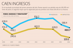 Y es que, derivado de una caída de 31% en el precio de la mezcla mexicana de exportación, de 22% en el precio del gas natural y de una pérdida de 3.34 pesos por dólar en la paridad cambiaria en un año, los ingresos de la estatal cayeron en 18% de un año a otro en los primeros seis meses del año, sumando 480,698 millones de pesos.